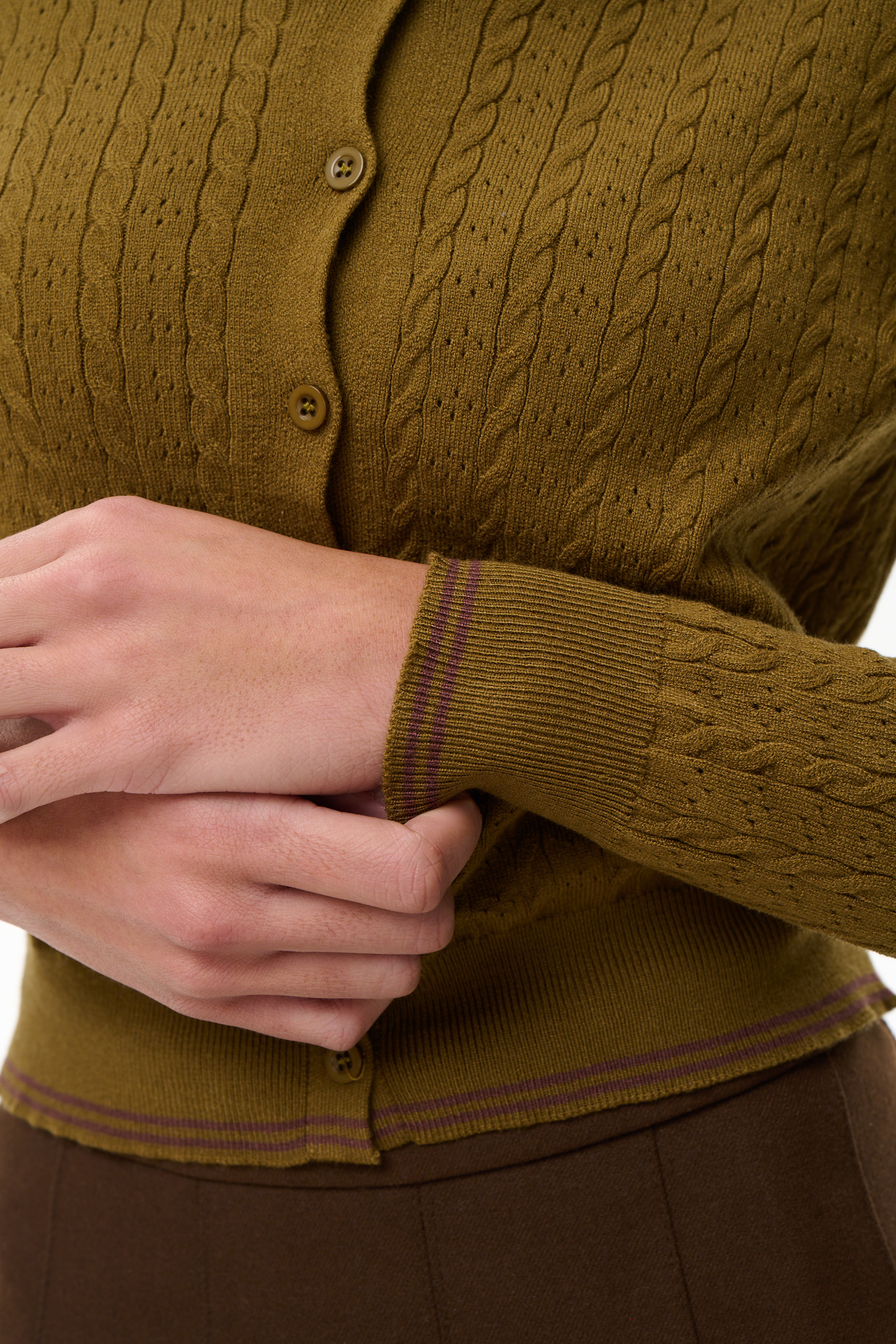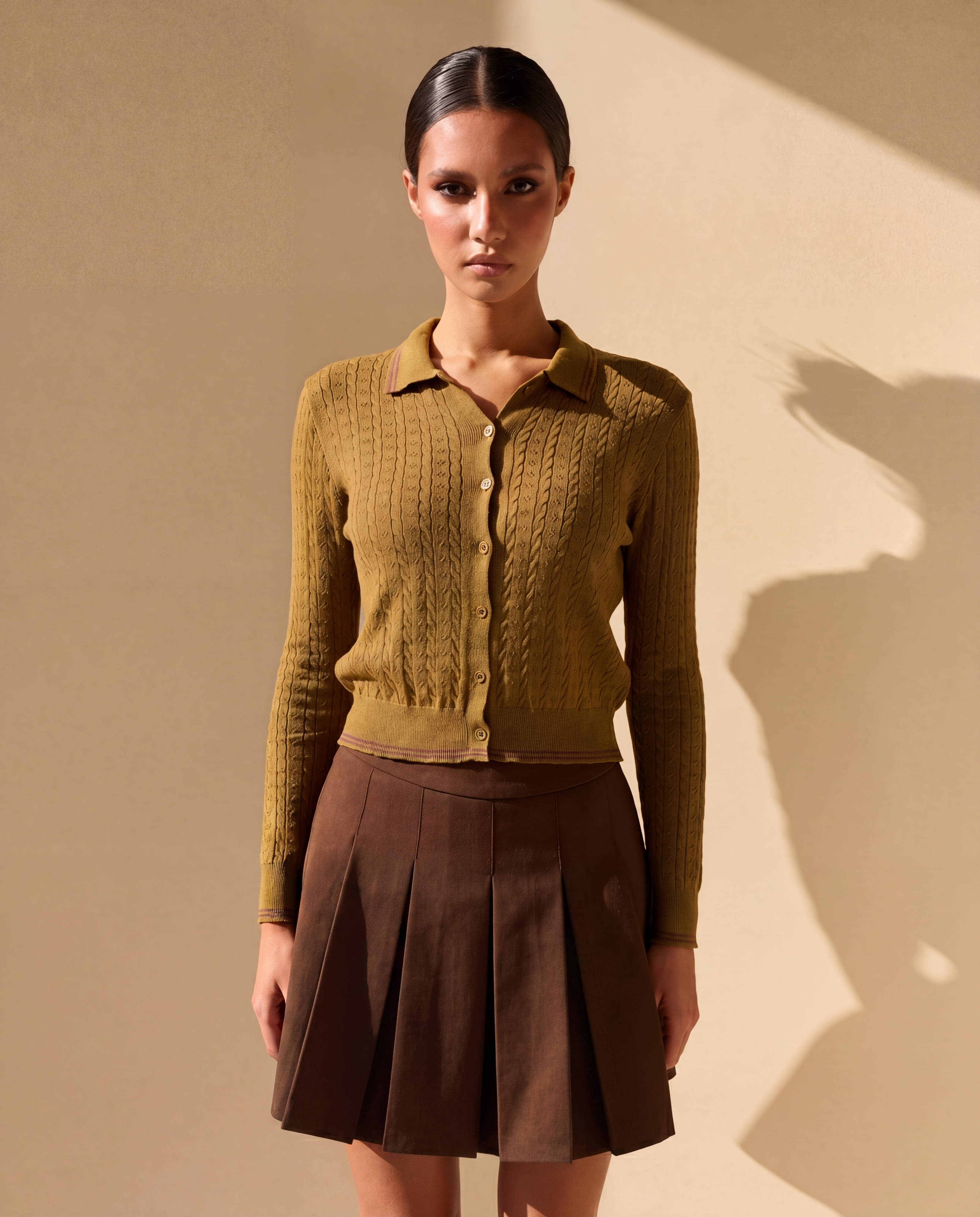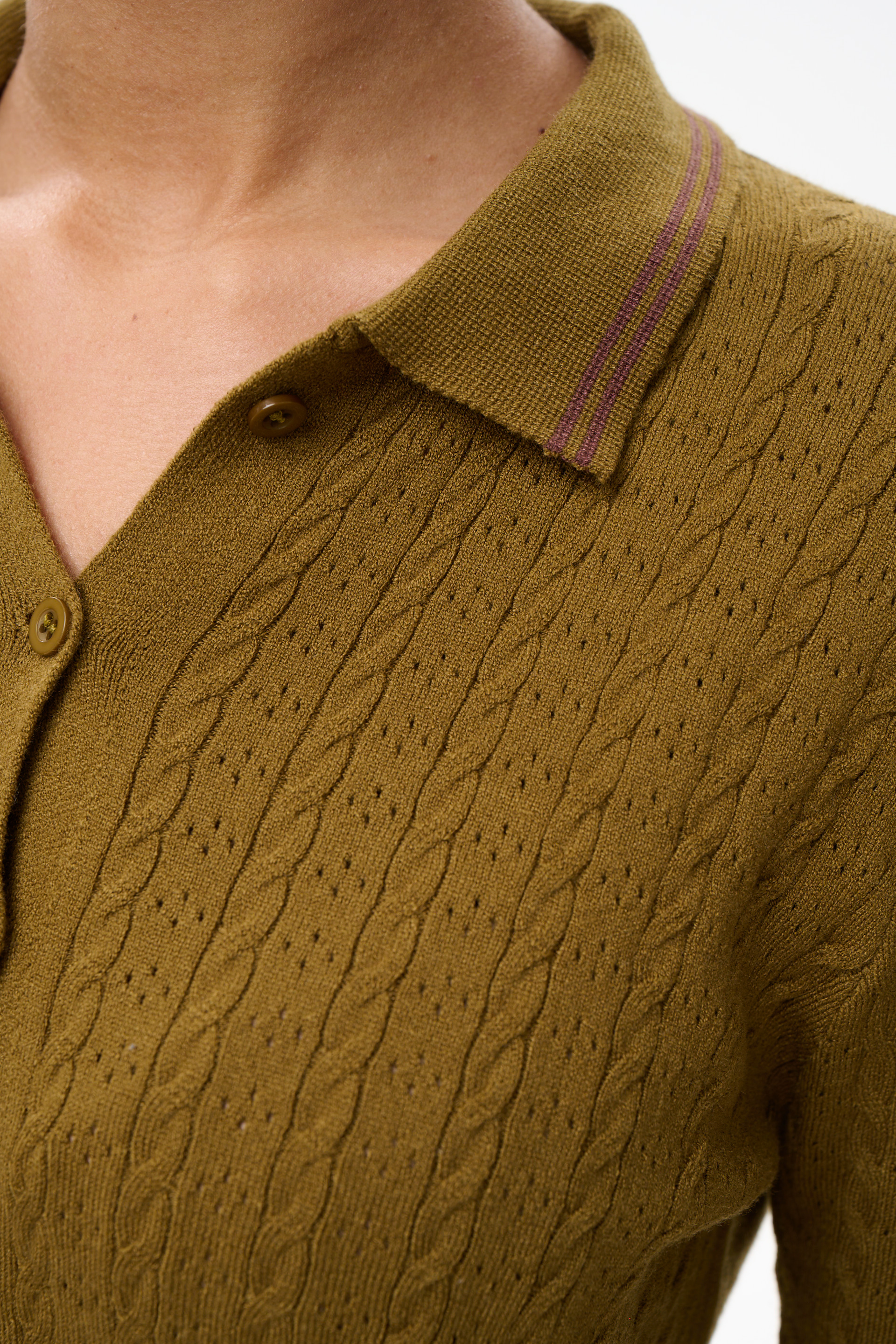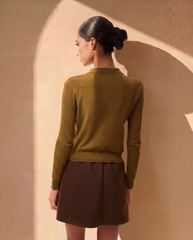 Оливковый цвет придаёт изделию глубину и легко сочетается с базовым гардеробом — от тёплых коричневых оттенков до светлого денима и молочных тонов. Эта кофта-поло подойдёт как для повседневных образов, так и для более собранных сочетаний, оставаясь комфортной и стильной в любой ситуации.
